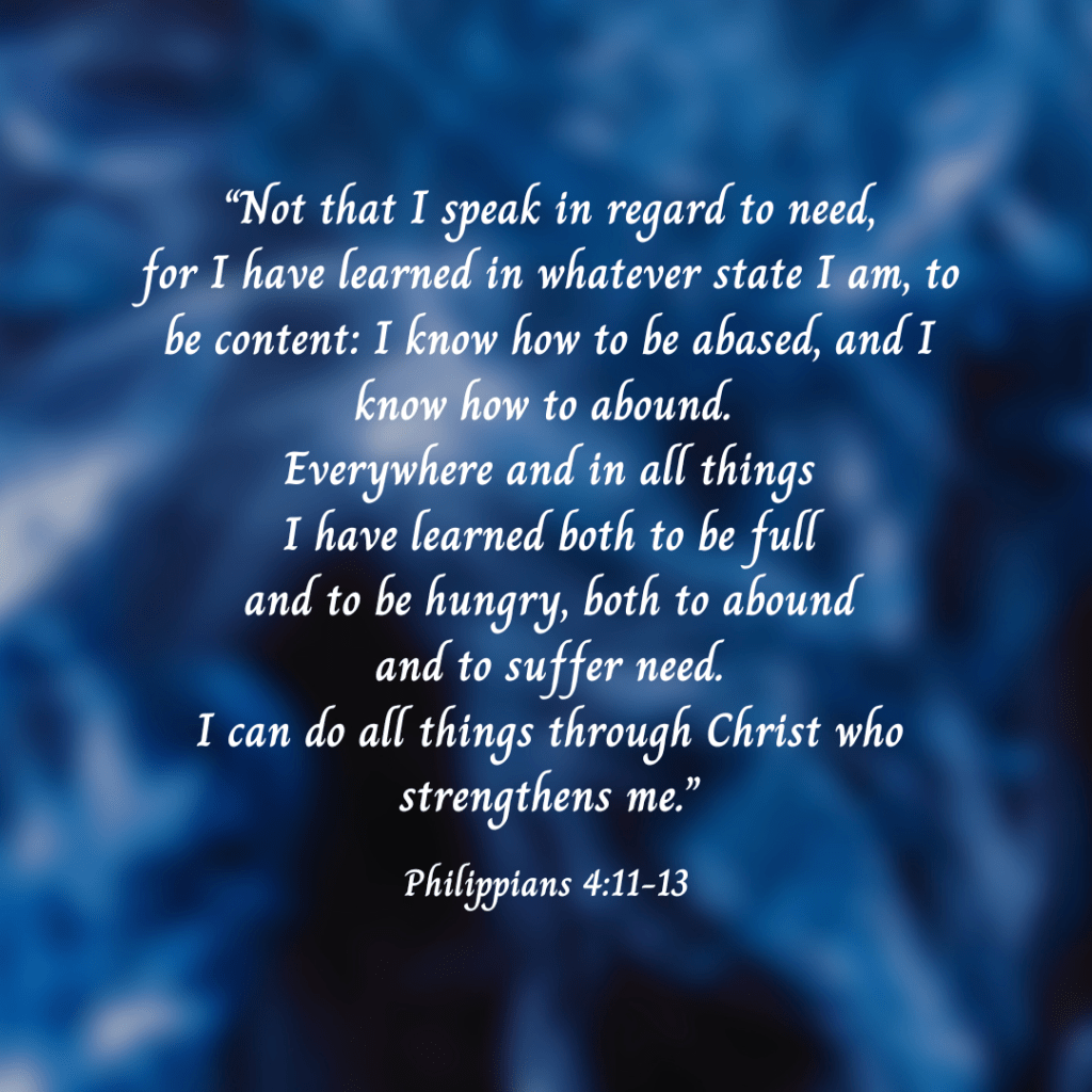 I am not saying this because I am in need, for I have learned to be content whatever the circumstances. I know what it is to be in need, and I know what it is to have plenty. I have learned the secret of being content in any and every situation, whether well fed or hungry, whether living in plenty or in want. I can do all this through him who gives me strength.