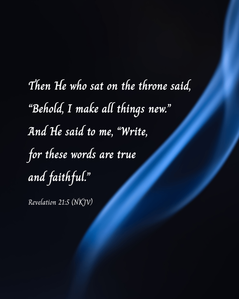 Then He who sat on the throne said, “Behold, I make all things new.” And He said to me, “Write, for these words are true and faithful.”